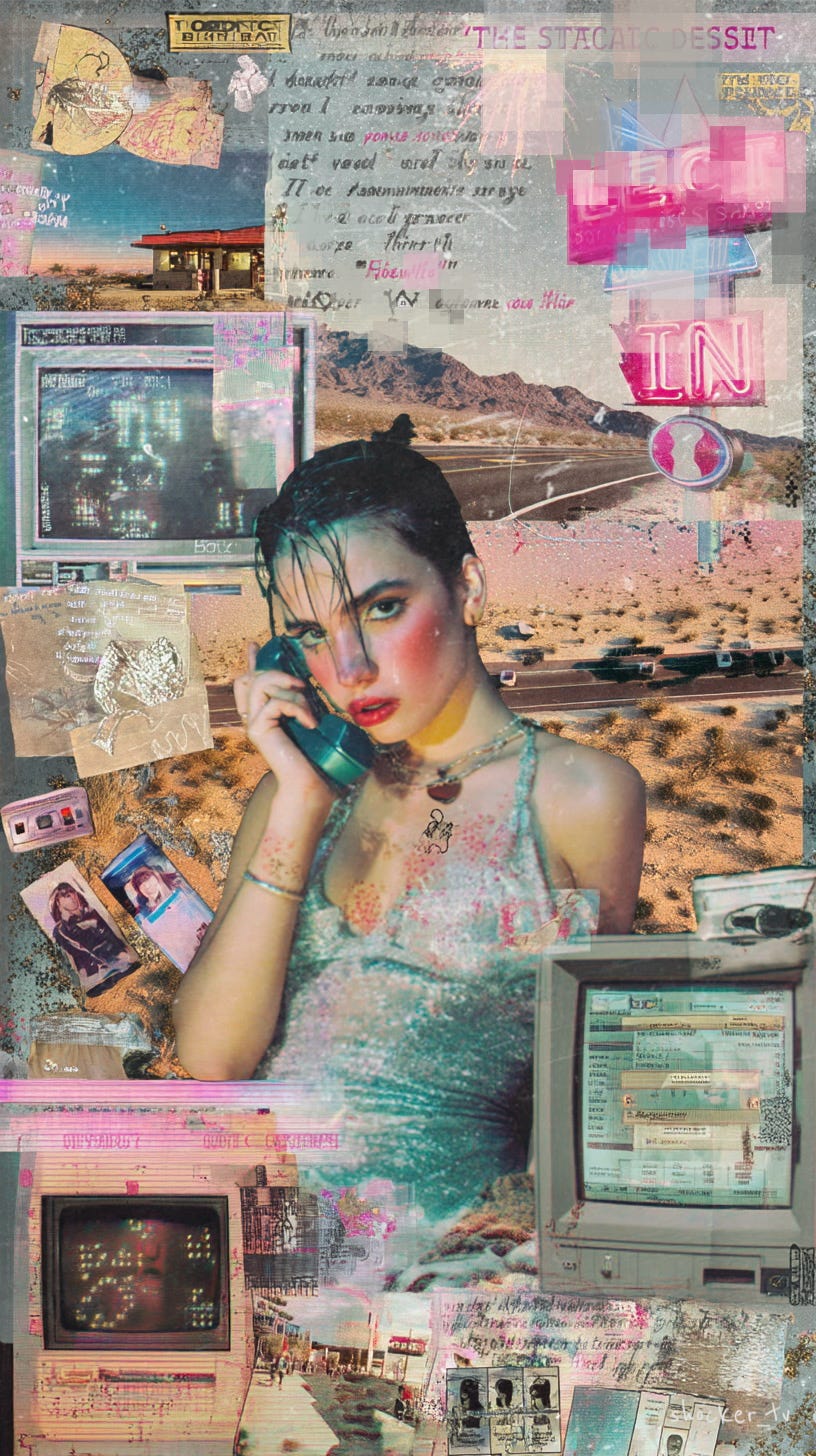 It’s a skipped frame between one America and the next—half-loaded, half-erased. The highway hums like a VHS left on pause too long, the image burnt into the screen, color bleeding at the edges. There’s a sound to it: a high, trembling note that lives somewhere between a dial tone and a dying star. You could call it silence if you didn’t know better.